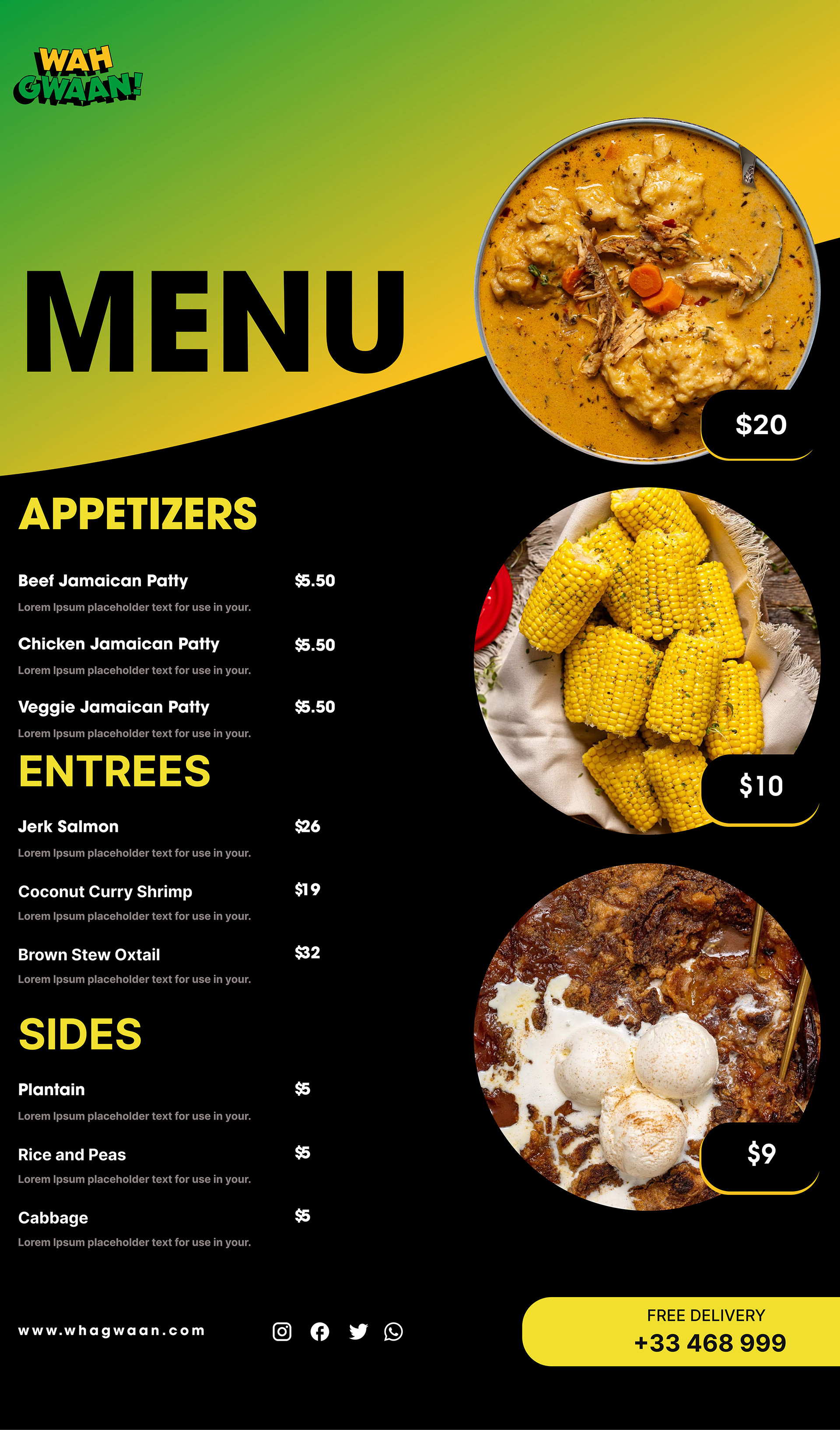 I wanted to build a vibrant visual identity around the popular Jamaican phrase Wah Gwaan, capturing both cultural warmth and contemporary design sensibilities.